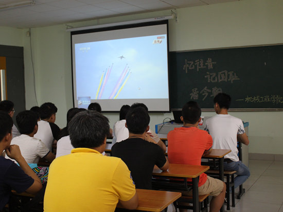 当天上午,机械工程学院的同学们分小组在不同地点观看了整个纪念活动。大三的同学们以宿舍为单位,早早地就集中到一个同学的电脑前,大二的同学们以班级为单位在不同教室进行观看。十点整,阅兵仪式在70响礼炮声中正式开始,国旗护卫队在礼炮声中护卫着国旗走向升旗台,伴随着国歌五星红旗冉冉升起。随后国家主席习近平发表了重要讲话,在短短十多分钟的讲话中,习近平主席多次提及“和平”,向全世界表明中国人民独立自强、爱好和平。之后的中国人民解放军分列式的展示更是激动人心,整齐的步伐,昂扬的身姿,先进的武器都让观看阅兵式的每一个人都振奋不已。而老兵方阵的出现,给我们带来的更多是感动。他们为抗战做出了巨大的贡献。我们每一个人都应该感谢前辈的付出,为我们创造了今天这样和平的环境。