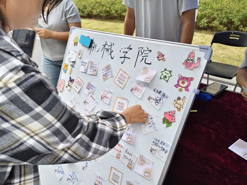 在“心灵寄件”区,同学们在五彩的贴纸上认真写下自己对大学四年的期待与梦想。“希望学业有成”、“结交一群志同道合的朋友”、“探索更广阔的世界”……一张张小小的贴纸,汇聚成一片承载着希望与憧憬的“心愿墙”,为他们的大学旅程注入了最初的动力。