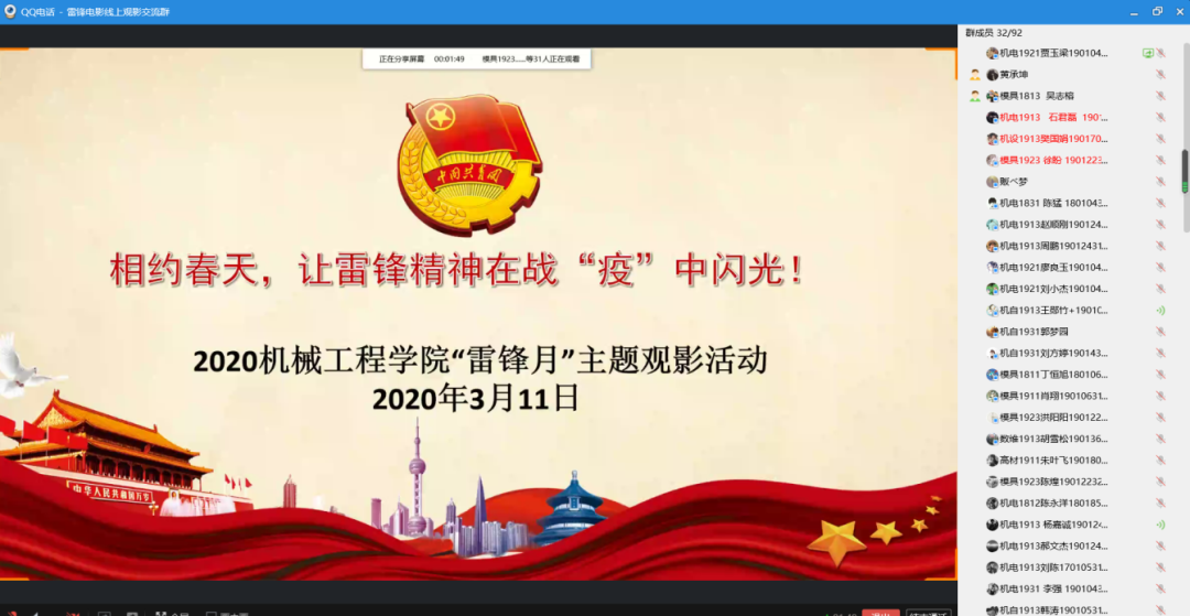 为进一步弘扬学习雷锋精神,引导广大青年参与到志愿服务中,在2020年3月11日下午通过线上平台进行了观影交流。