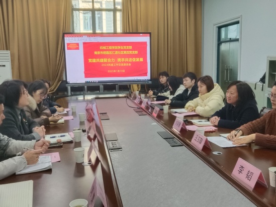 1月10日上午,南京市栖霞区汇通社区党委书记郝智慧一行4人来到机械工程学院交流座谈,机械工程学院党委书记刘英慧、学生党支部师生代表共13人参加交流会。